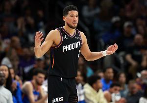 第一节,太阳球星布克高效发挥,打满12分钟10投6中,罚球3中3砍下15分2篮板1助攻。