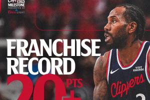 伦纳德单赛季连续45场比赛得分20+,超越鲍勃·麦卡杜(1974-75赛季,连续44场)独占快船队史第一。