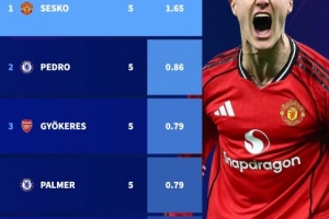 舍什科新年后场均1.65球,英超所有至少进5球球员中效率最高