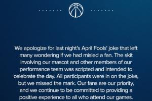 体育资讯04月03日讯 奇才官方今日发布声明,表示为愚人节恶作剧向球迷道歉。