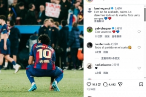 巴萨边锋亚马尔社媒晒出赛后低落的照片,并写道:“这一切还没有结束,巴萨球迷们。我们将在次回合比赛中倾尽所有。永远团结一心。”